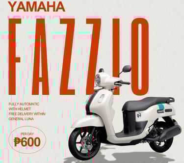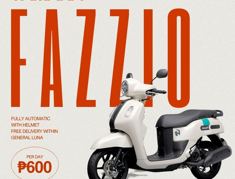 Explore the island at your own pace with our premium motorbike rentals. We offer well-maintained, fuel-efficient units like the Yamaha Fazzio and Honda Click, featuring free delivery within General Luna and safety helmets for a hassle-free ride.